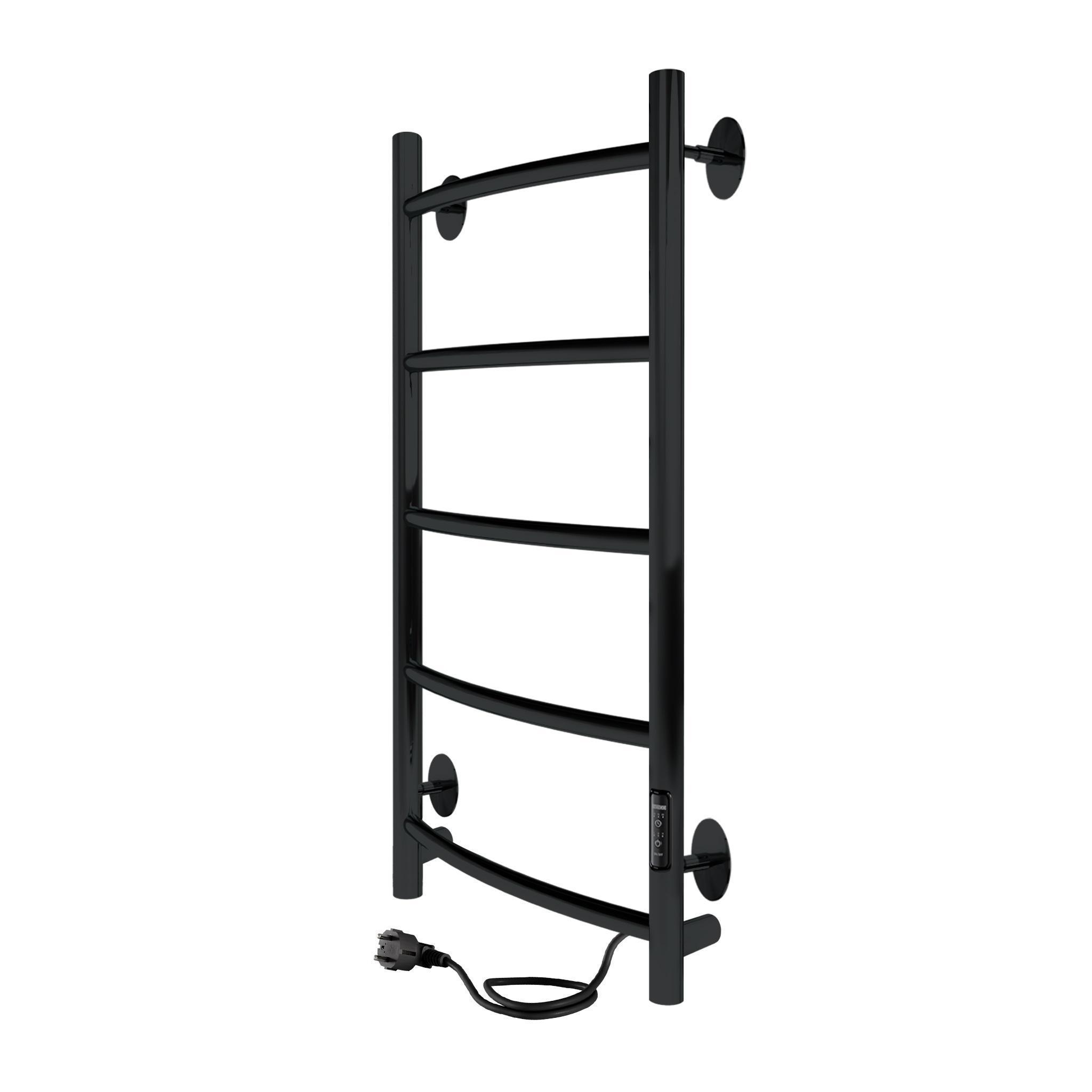 Полотенцесушитель электрический INDIGO Arc Lux. Изделие в форме «лесенка» с дугообразными перекладинами выполнен в цвете «Черный Муар». Качественная металлообработка в местах соединений обеспечивает плотное прилегание прокладки.