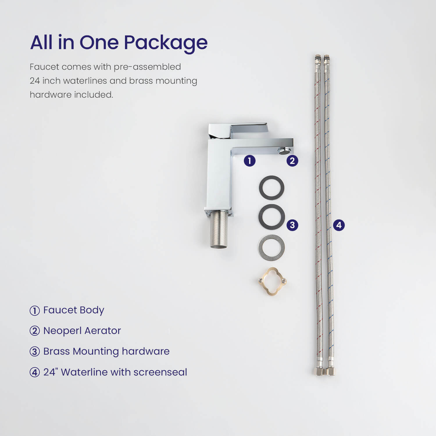 - Комплектация: Смеситель - 1 шт. Гибкая подводка - 2 шт. Набор креплений - 1 шт. Инструкция - 1 шт.