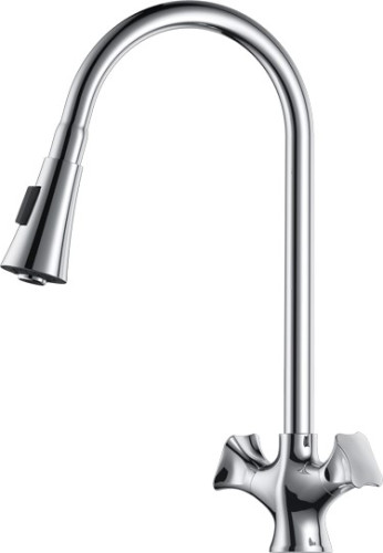 Блестящий внешний вид двухручкового смесителя привлекает своим внешним видом, послужит прекрасным дополнением классической кухни, с функциональной выдвижной лейкой, работающей в двух режимах.