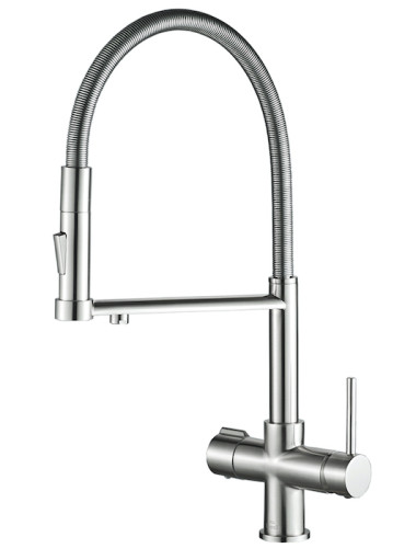 В смесителе применена технология "двойного канала", которая позволяет подключить питьевой фильтр сразу к смесителю. Вода подается не смешиваясь по разным каналам. Рукоятка управления водопроводной водой находится справа от носика, управление питьевой водой - слева.