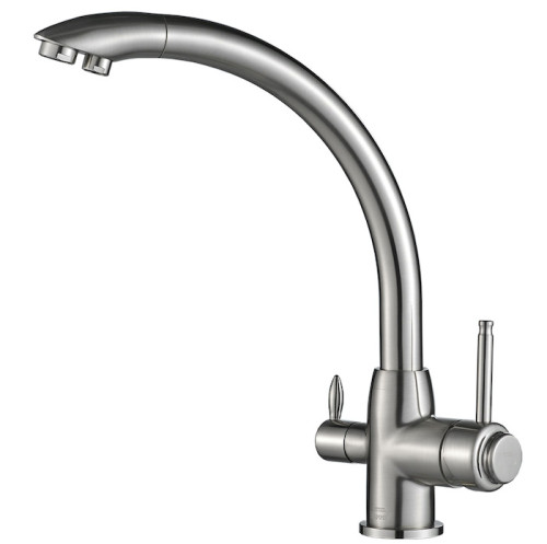 Смеситель под фильтр 2 в 1 для кухни модель SH-699 представляет коллекцию смесителей Steel Hammer. Прекрасно гармонирует с кухонными мойками ZORG из нержавеющей стали и мойками других производителей.Технология комбинированного смесителя два в одном позволяет получать водопроводную и очищенную воду из одного смесителя. Благодаря "двойному каналу" в изливе смесителя, вода подается не смешиваясь по разным каналам. Рычаг управления водопроводной водой справа от излива, питьевой - слева.